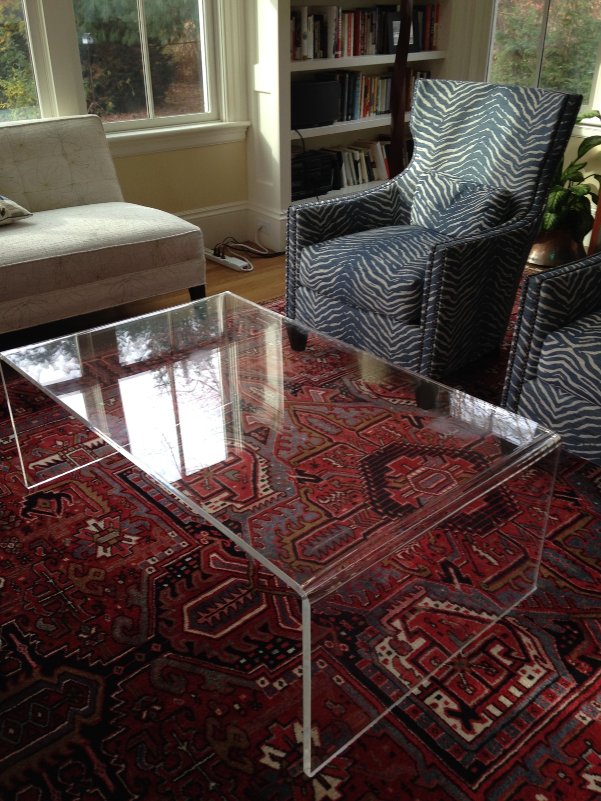 Coffee table waterfall style sizes please choose a thickness: Our large c side table lets this antique oushak rug and milo baughman chair shine. This table is clear, without that greenish tinge you see in most glass waterfall tables. Neiman marcus interlude home channing acrylic coffee table. 15 high 26 long 14 deep